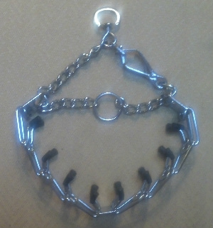 This type of quick release prong collar has a clip that holds on to part of a chain. This one has plastic prong covers for dogs with more sensitive necks.