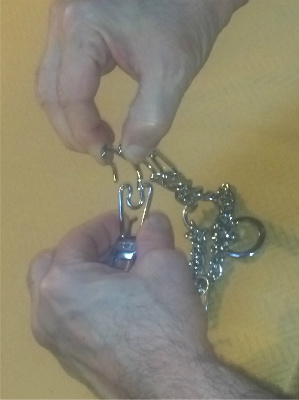 Standard prong collars are put on the personal protection dog by pinching and unhooking a link and then re-linking it after it’s around the dog’s neck.