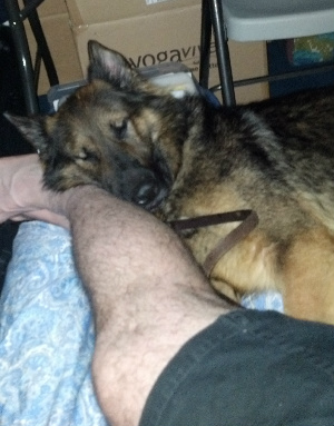 What a big baby! He laid down with his head on my leg and went right to sleep. I’m not kidding about this. I thought to myself, “I’m falling in love with this dog, but the guard dog company ripped me off. This dog is a woosie. I’m not going to get rid of him, but I’m sure he’ll be worthless when it comes to defending me.”